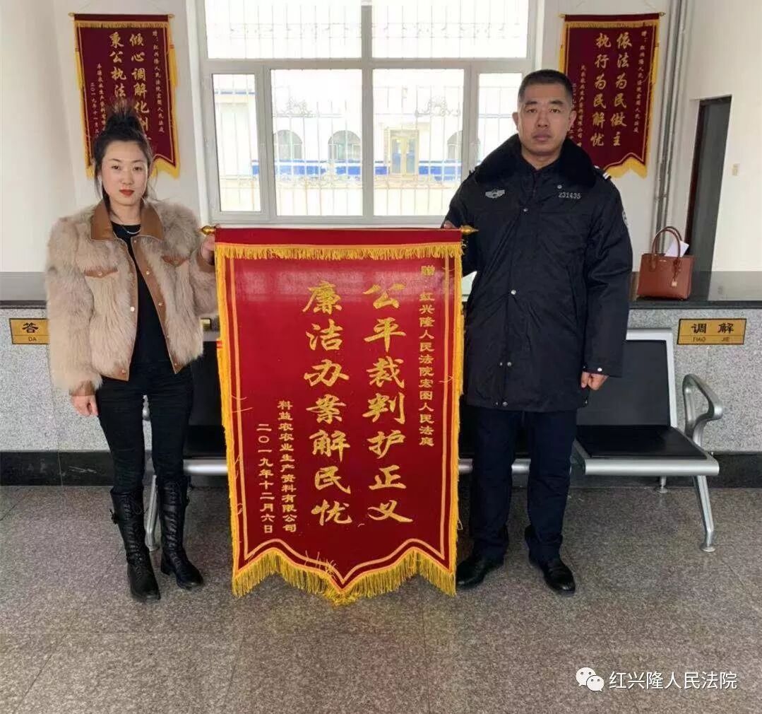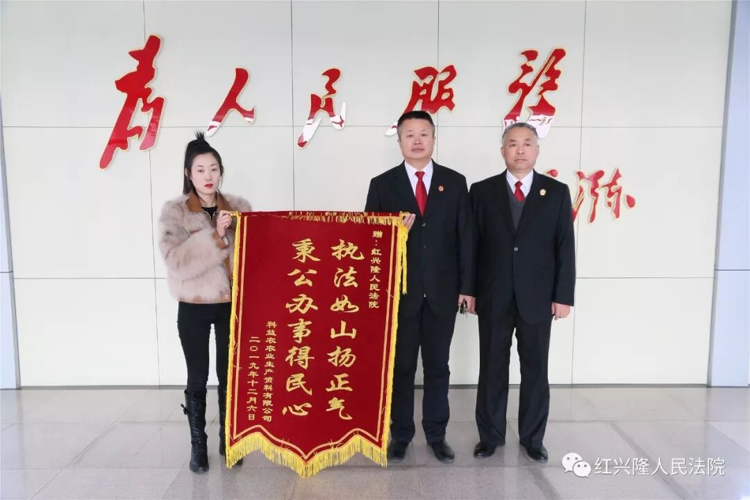 黑龙江红兴隆农垦科益农农业生产资料有限公司为表达感谢,将印有“执法如山扬正气 秉公办事得民心”、“公平裁判护正义 廉洁办案解民忧”的两面锦旗赠予红兴隆人民法院和宏图人民法庭,高度赞扬干警秉公办案、公平裁判。