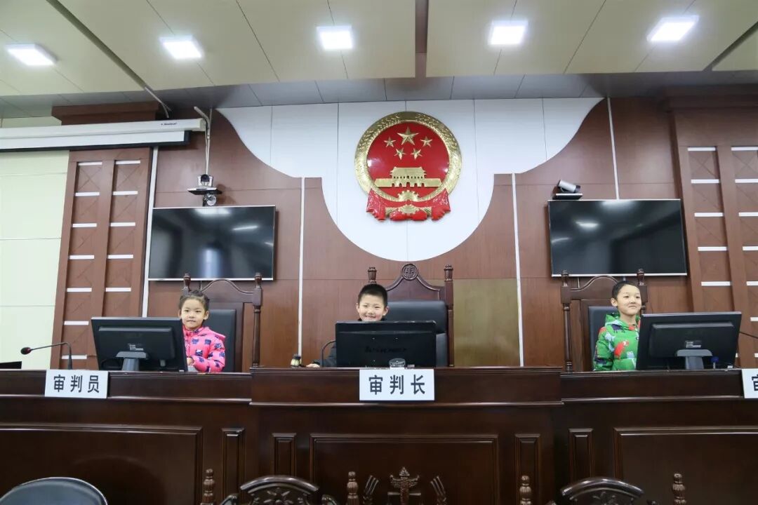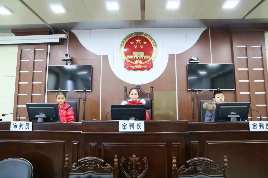 在数字化审判庭,学生、家长们了解了审判庭的构成、各区域的划分。干警为学生们讲解了法徽、法槌、法袍的含义和作用。同学们争相走上审判台,坐上审判椅,并拿起法槌,切身感受法律的威严。