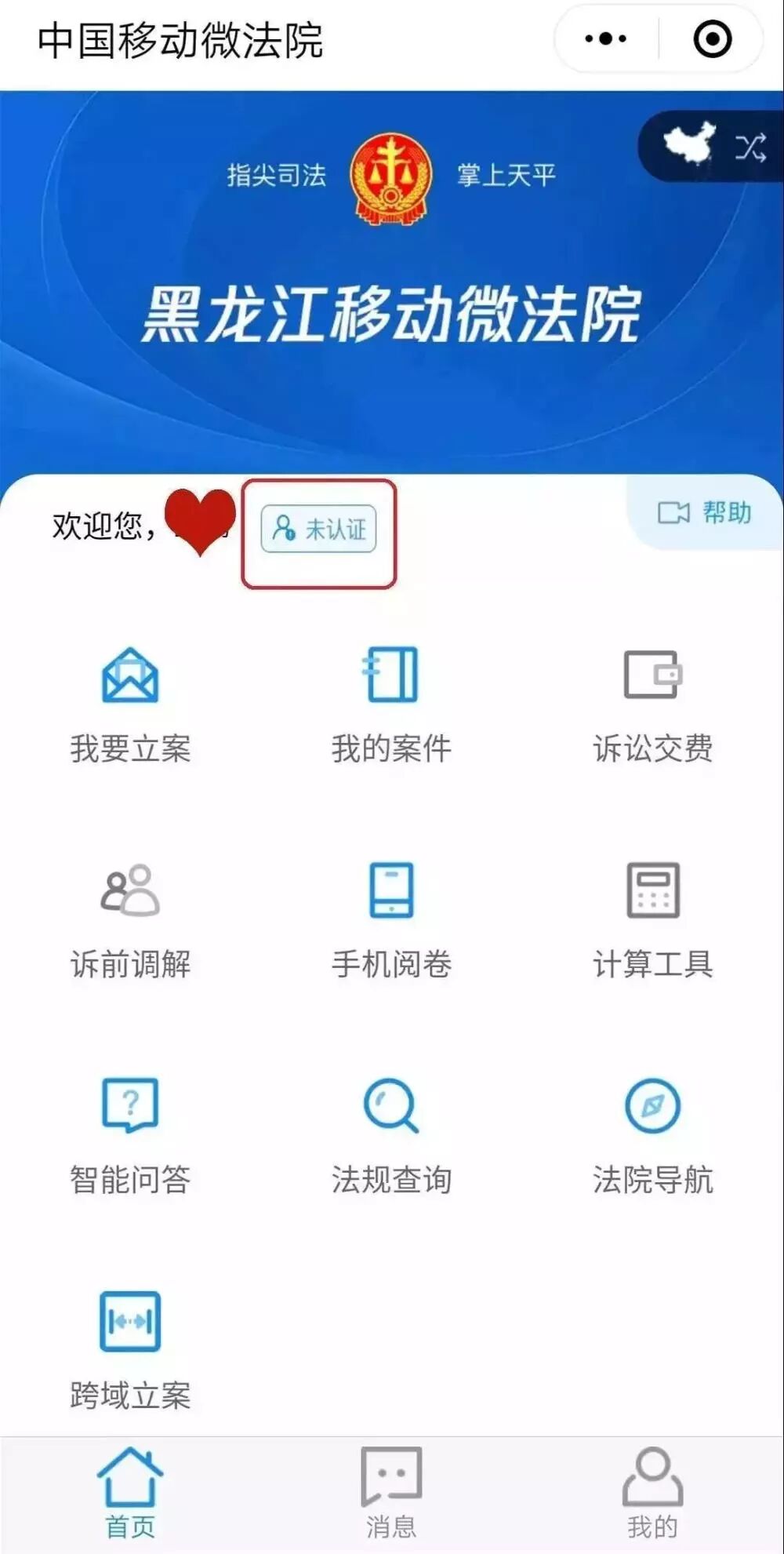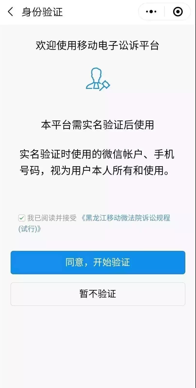 身份验证:进入“黑龙江移动微法院”小程序后,按照系统操作提示逐步输入姓名、身份证号、手机号码等信息,进行身份验证完成注册。