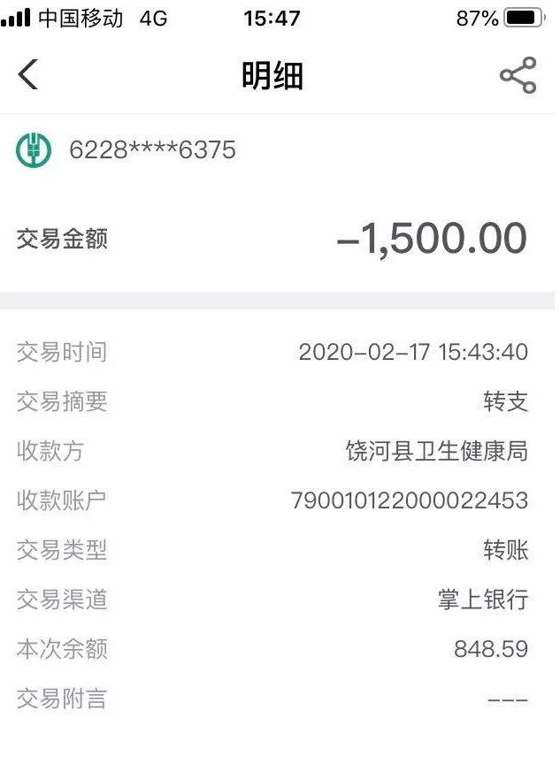 “疫情当前,做为一名共产党员不能奔赴抗疫一线,还能为社会做些什么?”双柳河人民法庭聘用干警李佳通过媒体得知一些地区急需抗疫物资,与爱人鞠鹏商量后,在疫情防控期间先后向湖北省慈善总会、江西省红十字基金会、中华少年儿童慈善救助基金会、五九七农场社区卫生服务中心累计捐款1600余元用于疫情防控工作。她说:“捐款没想声张,只希望尽一份微薄的力量,能为抗击疫情做点贡献”。