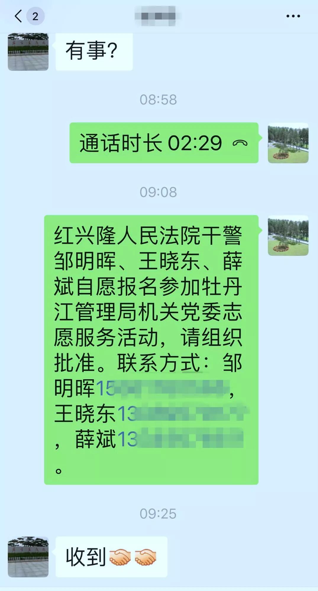 家住牡丹江管理局的党员干部也主动向当地机关党委申请参加抗疫志愿者服务活动。因疫情爆发滞留在家庭住地的立案庭负责人刘太明,主动申请加入了密山市生态环境局的防疫值班队伍,在卡口进行人员出入的登记。
