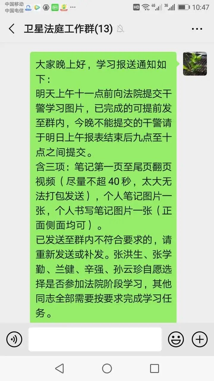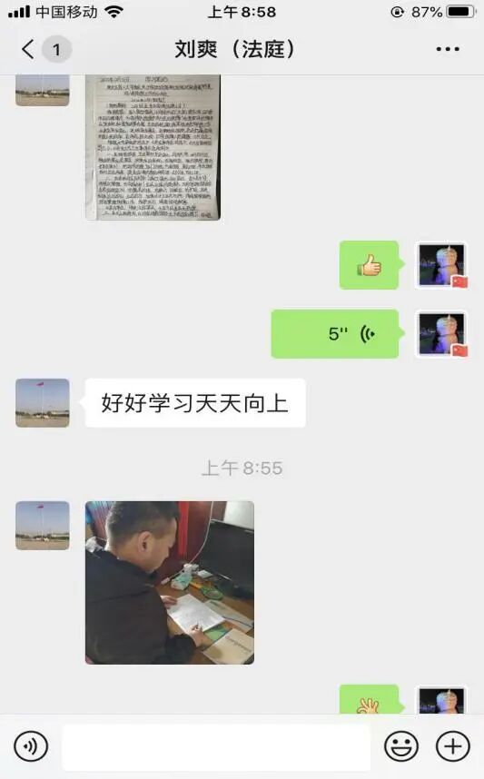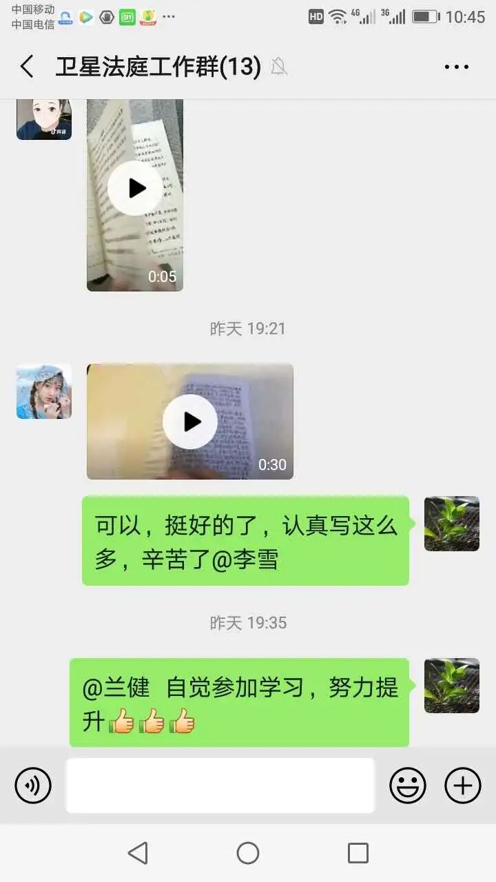 卫星人民法庭积极倡导坚持理论学习、坚持自我提高的良好风尚,确保理论学习不搞花拳绣腿,不搞形式主义。要求干警将每日学习进度在群内打卡,按部就班开展学习交流活动,并在工作群里畅谈学习心得和感受。为避免形式化,要求每名干警将阶段性学习笔记录制视频提交,对学习笔记用视频方式检查和评比。在工作群内大家统一学习思路,严肃学习态度,互相比学习效果,比学习质量,比知识积累。