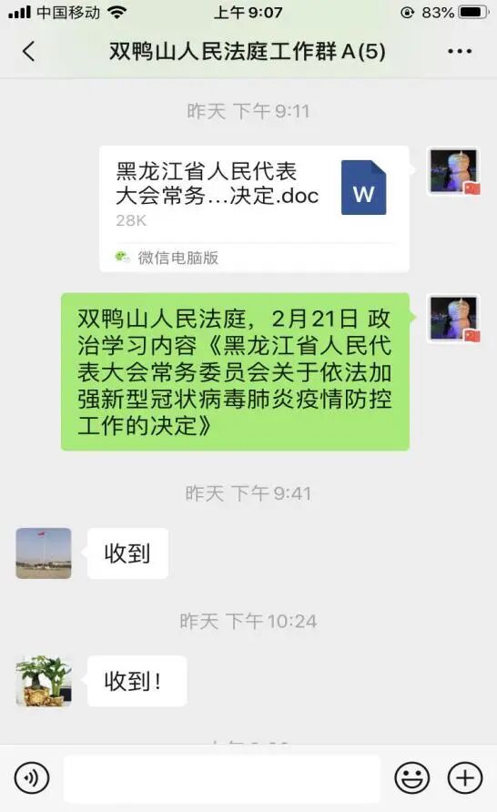 双鸭山人民法庭一方面要求全庭干警做好疫情防控,不外出,不聚集,分散办公,网络办公,同时积极组织干警在家通过网络学习的方式开展政治业务学习。为了进一步提高全庭干警政治站位,弘扬正能量,负责人韩继武安排专人组织全庭干警采用网络学习的形式,认真学习习近平总书记关于疫情防控的重要讲话精神、黑龙江省人大常委会《黑龙江省人民代表大会常务委员会关于依法加强新型冠状病毒肺炎疫情防控工作的决定》等法律法规,以及疫情防控知识,干警们都积极学习,认真做笔记。通过学习,法庭干警了解了疫情防控的指导思想、法律依据、防控原则、防控要求、防控措施以及惩戒规定,增长了疫情防控知识,为法庭在疫情防控期间更好地开展工作、维护社会稳定奠定了基础。