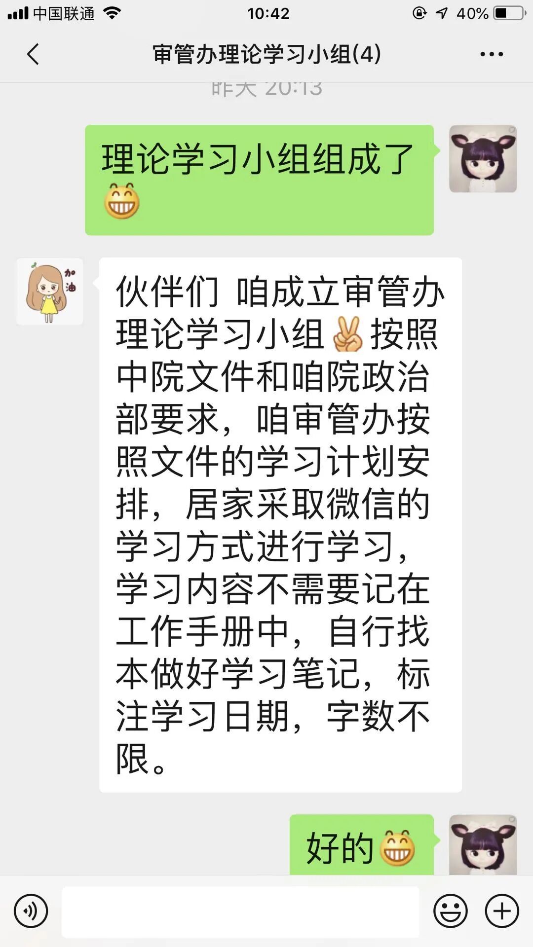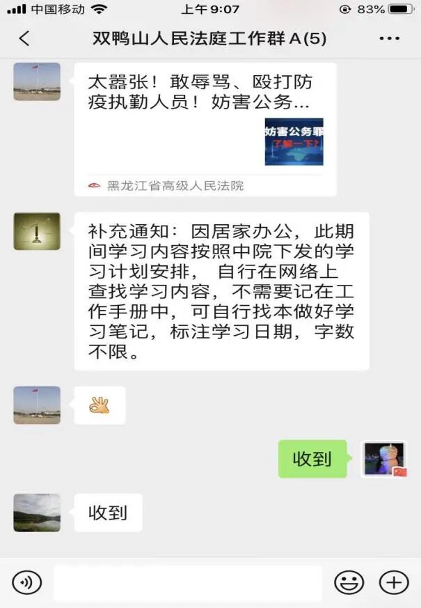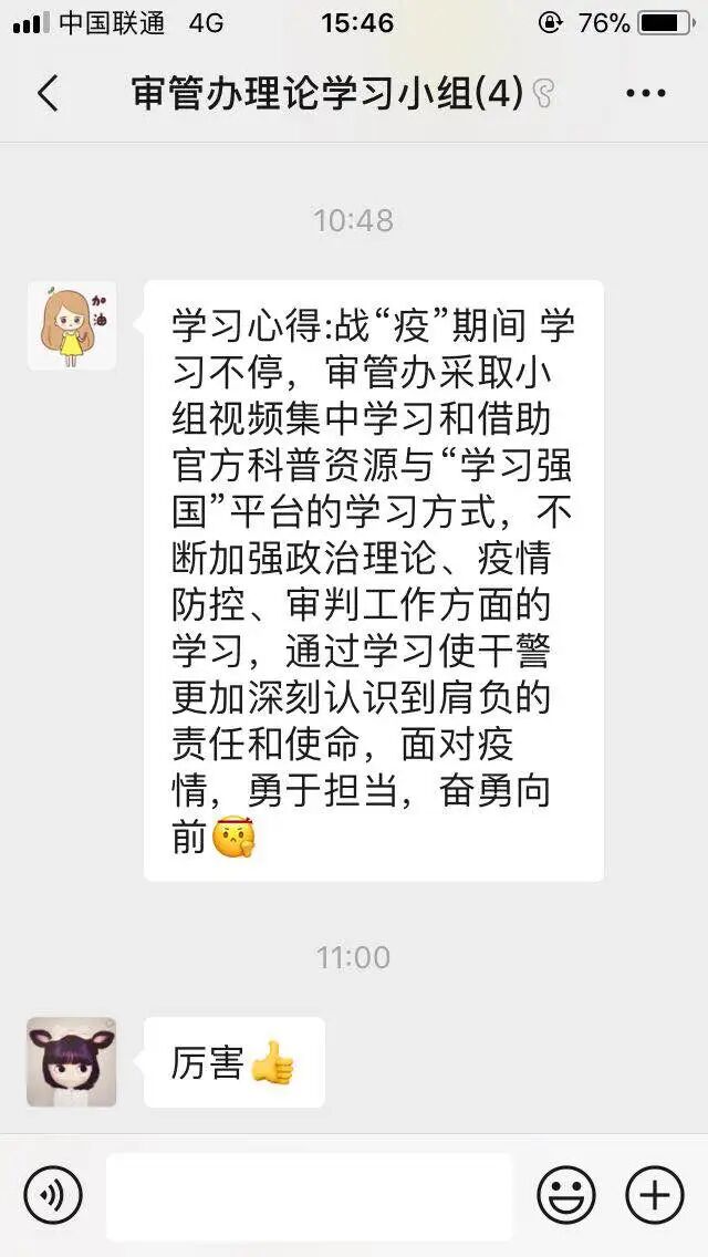 审管办充分运用微信群建立学习小组,搭建网上学习平台,采用视频学习、线上交流、撰写心得体会、学习笔记等方式,做到学习不集中、不聚集、不停步。同时借助“学习强国”优势平台,形成人人学、时时学、处处学的浓厚氛围,在不断加强政治理论和疫情防控工作方面的学习的同时,也注重与审判工作相关的学习内容,并结合工作实际进一步延伸拓展,深入思考如何做好本职工作及各项重点工作,形成良好的“居家”不停学氛围。