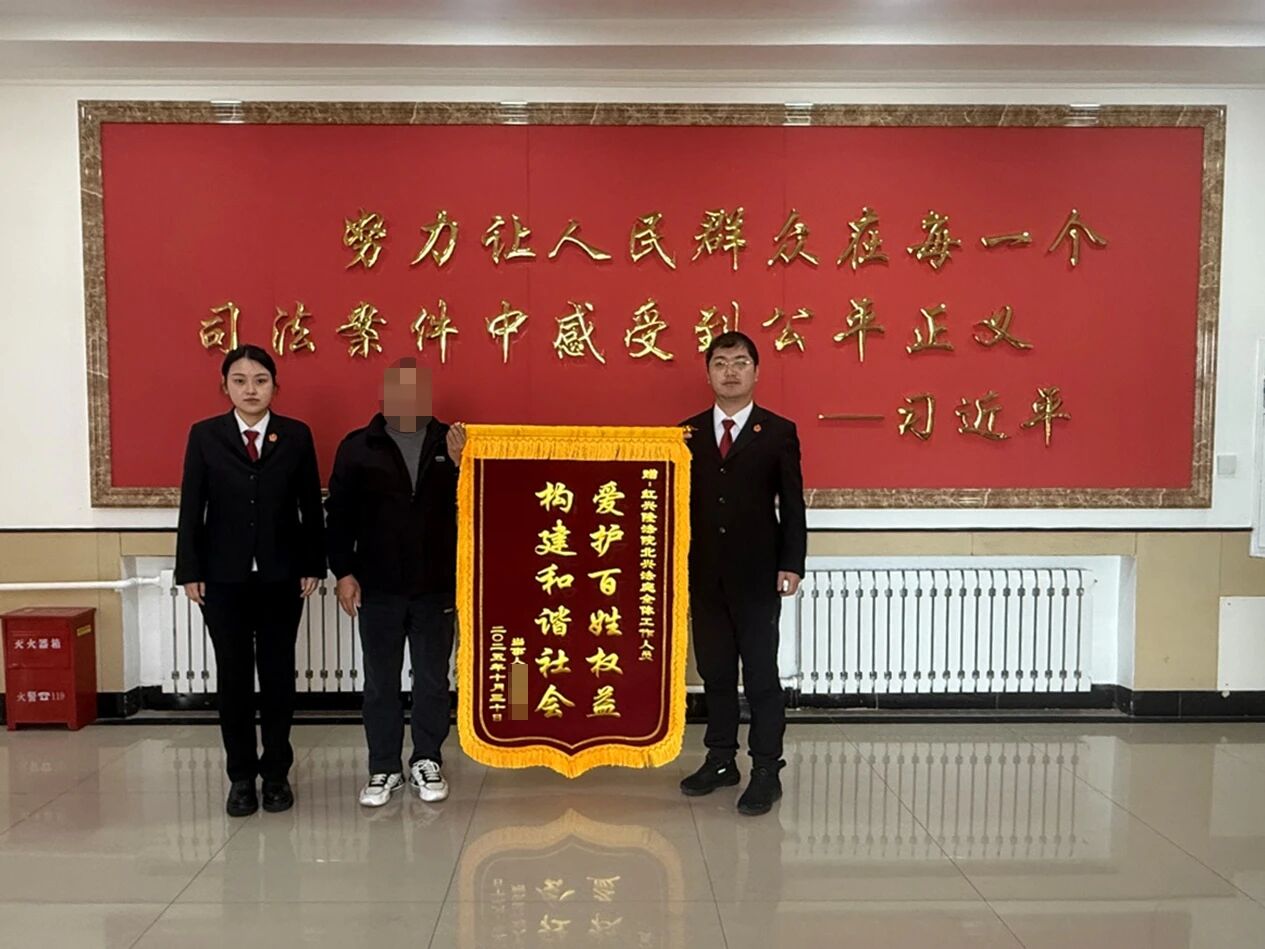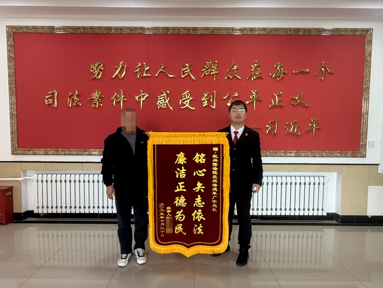 近日,红兴隆人民法院北兴人民法庭妥善化解了一起民间借贷纠纷案件,当事人岳某专程来到法庭,将两面分别印有“爱护百姓权益 构建和谐社会”和“铭心矢志依法 廉洁正德为民”的锦旗送到承办法官手中,以此表达对法庭公正高效、司法为民工作的诚挚谢意。