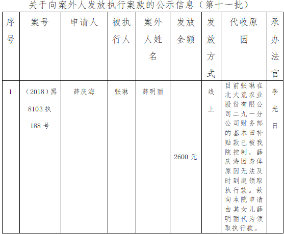 为完善执行案款管理制度,维护当事人合法权益,提升司法公信力和执行效率。依据《黑龙江省高级人民法院向案外人发放执行案款公示制度》的规定,现将向案外人发放执行案款信息予以公示,公示期7天:2025年12月11日至2025年12月17日。