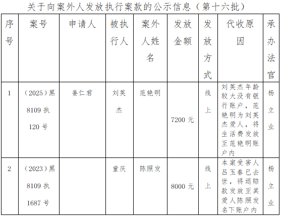 为完善执行案款管理制度,维护当事人合法权益,提升司法公信力和执行效率。依据《黑龙江省高级人民法院向案外人发放执行案款公示制度》的规定,现将向案外人发放执行案款信息予以公示,公示期7天:2026年1月7日至2026年1月13日。