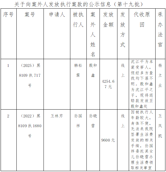 为完善执行案款管理制度,维护当事人合法权益,提升司法公信力和执行效率。依据《黑龙江省高级人民法院向案外人发放执行案款公示制度》的规定,现将向案外人发放执行案款信息予以公示,公示期7天:2026年1月19日至2026年1月25日。