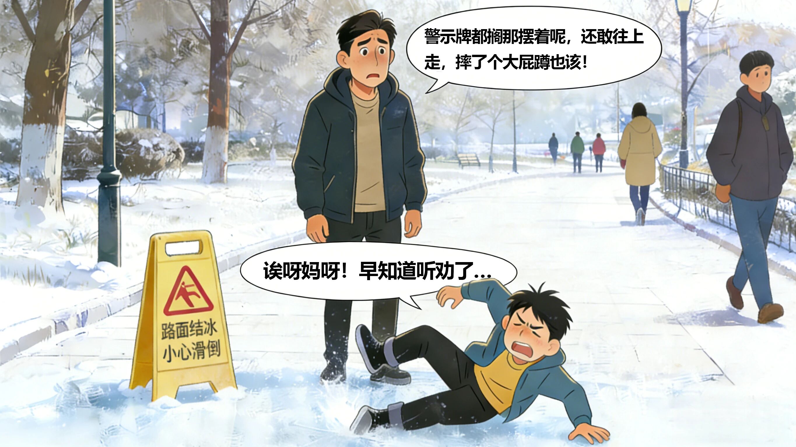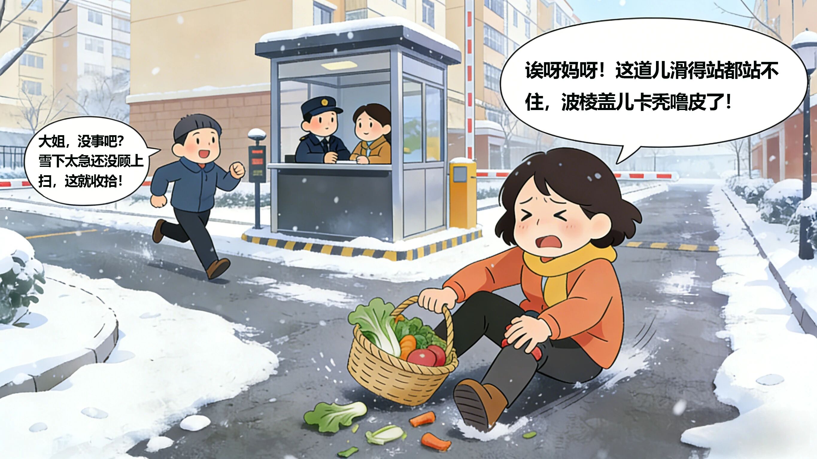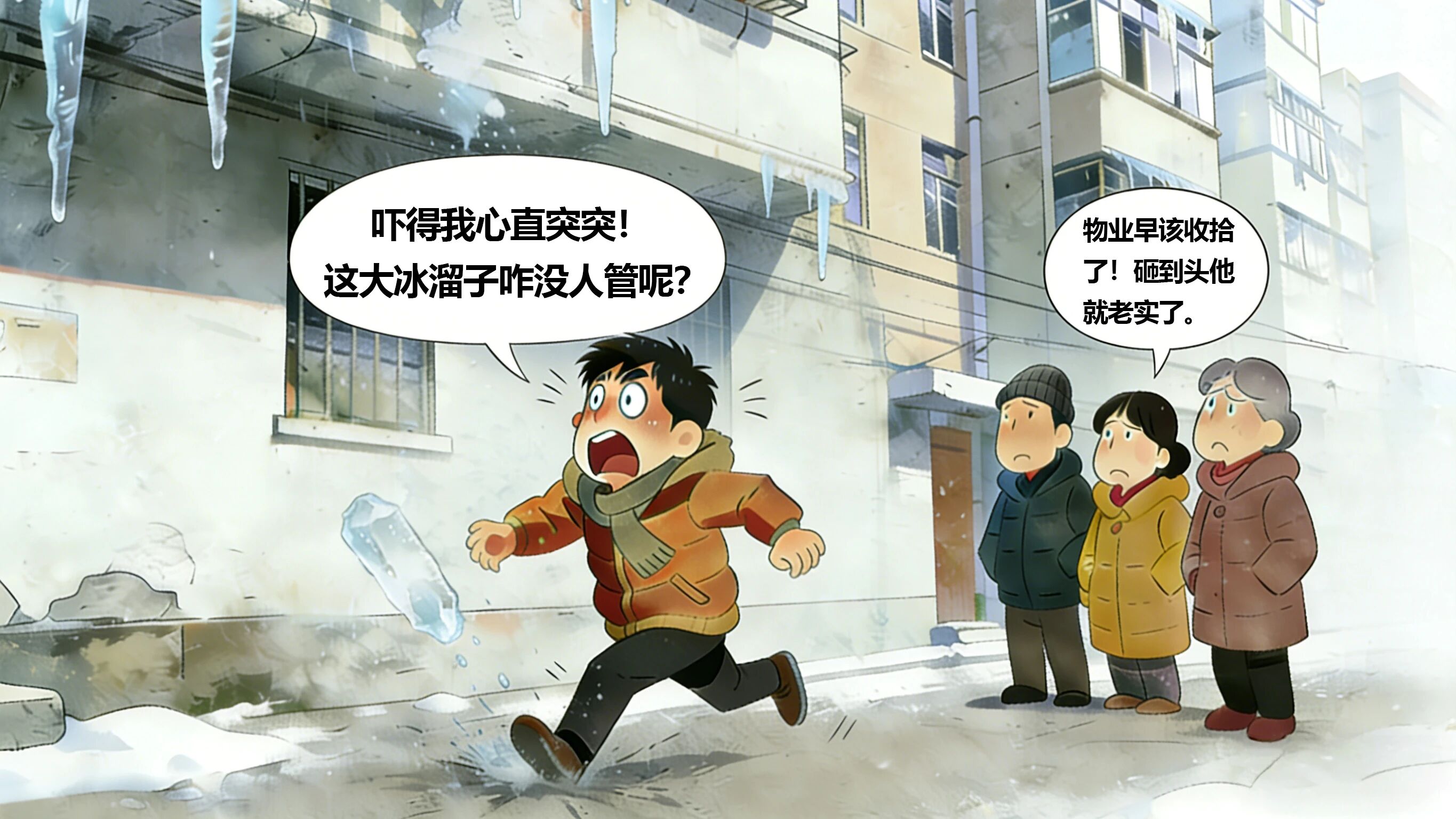 因雪后路滑、冰锥坠落、管道冻裂等