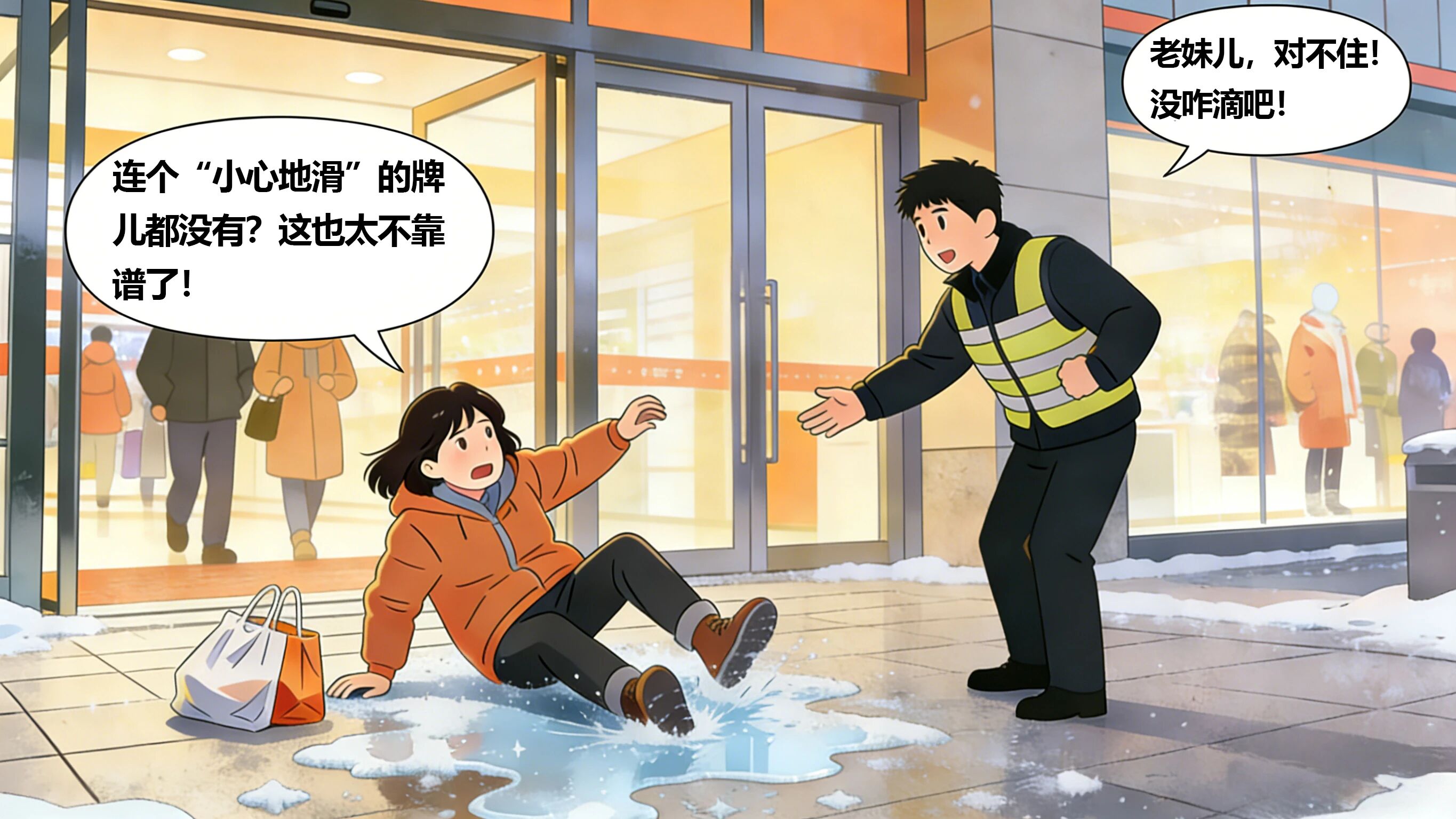 在商场、超市、酒店等经营场所或公共人行道滑倒。该类场所的经营者、管理者或市政环卫等负责单位,同样负有法定的安全保障义务。若未及时清除积雪积冰、未设置明显的安全警示标志、未采取必要的隔离防护措施,造成他人损害,管理人需承担赔偿责任。