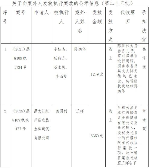 为完善执行案款管理制度,维护当事人合法权益,提升司法公信力和执行效率。依据《黑龙江省高级人民法院向案外人发放执行案款公示制度》的规定,现将向案外人发放执行案款信息予以公示,公示期7天:2026年1月30日至2026年2月5日。