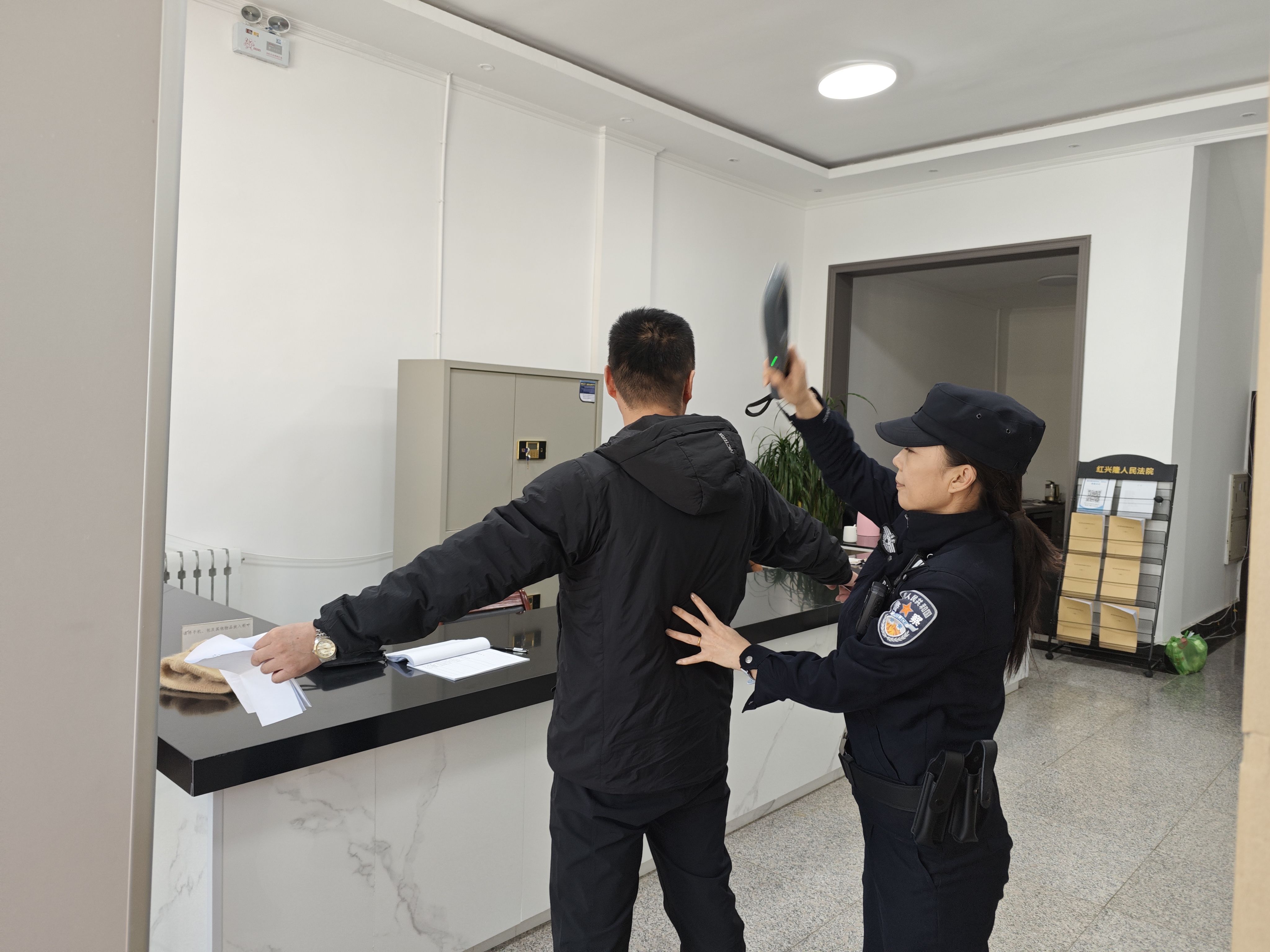 “您好,请配合安检。”早上8点,司法警察大队的干警们已准时到岗。他们身姿挺拔,眼神专注,严格把好法院的“第一道关卡”。查码验证、物品检查、有序引导……每一个细节都一丝不苟。他们用严谨与温情,为来院的每一位当事人筑起最坚固的安全屏障。