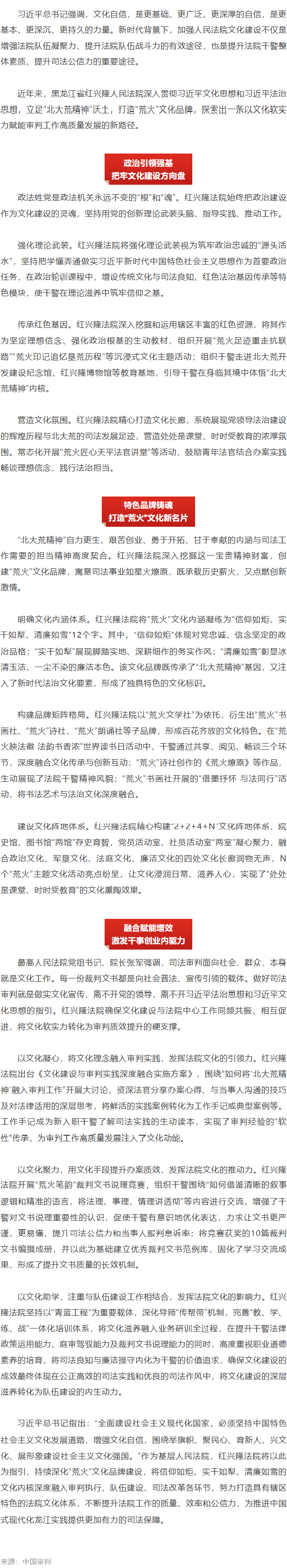 红兴隆人民法院党组书记、院长卜洪元在2026年第2期《中国审判》“院长论坛”栏目中发表署名文章《立足精神沃土 打造文化品牌 推动新时代法院工作高质量发展》,介绍了红兴隆人民法院立足“北大荒精神”沃土,打造“荒火”文化品牌,探索出一条以文化软实力赋能审判工作高质量发展的新路径。