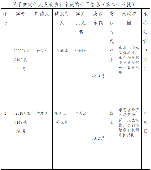 为完善执行案款管理制度,维护当事人合法权益,提升司法公信力和执行效率。依据《黑龙江省高级人民法院向案外人发放执行案款公示制度》的规定,现将向案外人发放执行案款信息予以公示,公示期7天:2026年3月4日至2026年3月10日。
